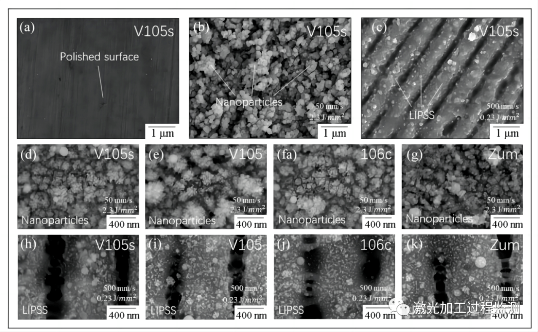 圖6.飛秒激光納米結構表麵的形貌:(a)V105s的拋光表麵;(b)V105s的納米粒子結構表麵;(c)V105的LIPSS;(d-g)Zr-BMGs的納米顆粒結構表麵;(h-k) Zr-BMG的LIPSS。