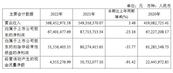 2022年,公司營業(ye) 收入5.68億(yi) 元,同比增長3.48%;歸屬於(yu) 上市公司股東(dong) 的淨利潤6740.15萬(wan) 元,同比下降23.16%;歸屬於(yu) 上市公司股東(dong) 的扣除非經常性損益的淨利潤5155.64萬(wan) 元,同比下降35.77%;經營活動產(chan) 生的現金流量淨額435.33萬(wan) 元,同比下降91.42%。