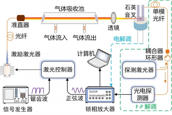由氣體(ti) 吸收引起的QTF振動是通過使用強度和相位解調方法解調法布裏-珀羅腔長度的位移來反演氣體(ti) 濃度來確定的。由於(yu) QTF的振動與(yu) 氣體(ti) 濃度成正比,因此可以通過解調相位來線性反演濃度。