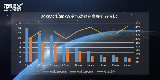 憑借硬件能力的提升,新一代8萬(wan) 瓦激光切割機的切割性能也有了大幅度提升。與(yu) 6萬(wan) 瓦激光切割機對比,在空氣切割20-60mm碳鋼領域,8萬(wan) 瓦激光速度提升30-50%。而在不鏽鋼切割領域,8萬(wan) 瓦激光切割速度比6萬(wan) 瓦提升20-30%(20-100mm)。