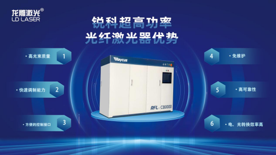 在核心光源方麵,龍雕激光選用銳科激光最新發布的80000W超高功率光纖激光器。這款新型激光器擁有更高的光束質量、更高的電光轉換效率以及更高的可靠性,能確保用戶在保證高質高效生產(chan) 的同時降低耗電量,同時其極佳的可靠性也能夠降低用戶的維護成本。