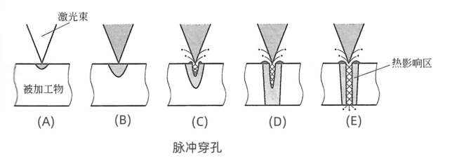 其過程如下圖所示:在激光束照射到被加工物上後,首先會(hui) 加熱材料表麵,如(A)所示;隨著加熱逐漸深入起到穿孔的作用,即(B)~(C)~(D),直到最後(E)所示的穿透。整個(ge) 穿孔過程不是一次完成的,而是多次不斷循序漸進,逐漸深入,直到穿透。因此,該方法穿孔的時間相對較長;但是,得到的孔較小,對周圍的熱影響也更小。