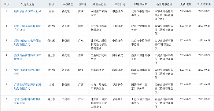 深交所方麵,節前一周也共新受理了5家公司,連同此前9月22日和9月6日分別受理的廣西北部灣陸海新能源股份有限公司(下稱陸海新能)、東(dong) 莞優(you) 邦材料科技股份有限公司,深交所9月份共計新受理了7家公司。這7家公司中,陸海新能的融資計劃額16億(yi) 元為(wei) 最大,另一家浙江美晶新材料股份有限公司的預計融資金額15個(ge) 億(yi) 。