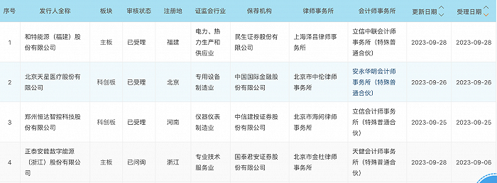 根據上交所網站,9月28日受理和特能源(福建)股份有限公司,9月26日受理北京天星醫療股份有限公司,9月25日受理鄭州恒達智控科技股份有限公司(下稱恒達智控),再加上9月6日受理的正泰安能數字能源(浙江)股份有限公司(下稱正泰安能),上交所9月來合計共受理了上述4家。其中,正泰安能計劃融資額為(wei) 60億(yi) 元,恒達智控計劃融資額為(wei) 25億(yi) 元。