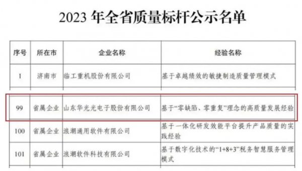 近日,山東(dong) 省工業(ye) 和信息化廳正式公布了2023年全省質量標杆名單,華光光電基於(yu) “零缺陷、零重複”理念的高質量發展經驗成果入選,彰顯了華光光電在質量管理模式創新方麵...