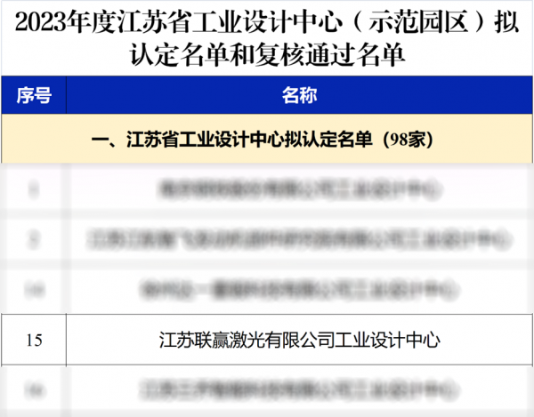 近日,江蘇省工信廳公示了2023年度江蘇省工業(ye) 設計中心(示範園區)擬認定和複核通過名單,江蘇聯贏激光有限公司工業(ye) 設計中心憑借完整的工業(ye) 設計和突出的科技創新能力成功入選。這是聯贏激光獲廣東(dong) 省工業(ye) 設計中心、廣東(dong) 省精密激光焊接裝備工程技術研究中心、廣東(dong) 省汽車激光智能焊接裝備企業(ye) 重點實驗室認定以來,又一個(ge) 被認定的省級技術創新平台。