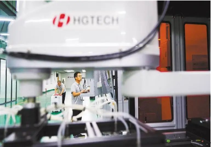 華工科技激光高端裝備製造車間,技術人員在調試超薄玻璃激光切割裝備