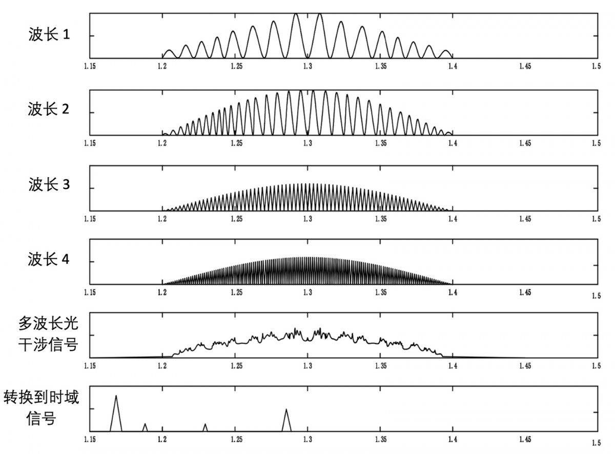 相幹光層析成像OCT技術。 光源(SLD)發出光經過分光器(splitter),將光分為(wei) 測量光束和參考光束。測量光隨著光纖到達反射鏡,兩(liang) 個(ge) 略成角度的反射鏡將測量光切分成匙孔測量光束(keyhole sub-beam)和表麵測量光束(surface sub-beam)。測量光到達匙孔底部和工件表麵後形成反射,兩(liang) 反射光與(yu) 參考臂的反射光發生幹涉,輸出幹涉信號。圖1為(wei) 多波長幹涉示意圖。對幹涉信號進行快速傅裏葉變換(FFT),即可得出測量臂相對參考臂的深度信息,即熔深信號。