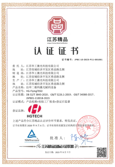 2 江蘇精品 2023年9月,Flying7000係列拉環二維碼賦碼設備被認定為(wei) “江蘇精品”。 “江蘇精品”是江蘇省運用市場機製推進品牌戰略的一項開拓性工作,通過對符合高標準、高品質要求的產(chan) 品和服務進行第三方認證,推動形成一批自主創新、品質高端、服務優(you) 質、信譽過硬、市場公認的“江蘇精品”品牌群體(ti) 。 Flying7000係列拉環二維碼賦碼設備為(wei) 江蘇華工激光自主研發設計的用於(yu) 金屬包裝行業(ye) 的專(zhuan) 精特新設備,主要應用於(yu) 飲料行業(ye) 兩(liang) 片罐二維碼賦碼,市場占有率超70%,為(wei) 國內(nei) 多家知名飲料行業(ye) 營銷市場推廣、防偽(wei) 防竄貨保駕護航。產(chan) 品特點為(wei) 高速、高精度、高穩定性,單機二維碼效率可達3000個(ge) /分鍾,二維碼可讀率≥99.99%,為(wei) 業(ye) 內(nei) 唯一集打碼、檢測、異常剔除、煙塵淨化、多通道模塊化設計等功能的係統解決(jue) 方案。