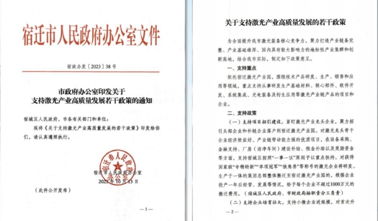 10月14日上午,中國宿遷第五屆激光裝備產(chan) 業(ye) 發展大會(hui) 在宿遷市區開幕,會(hui) 上,發布了《關(guan) 於(yu) 支持激光產(chan) 業(ye) 高質量發展的若幹政策》。