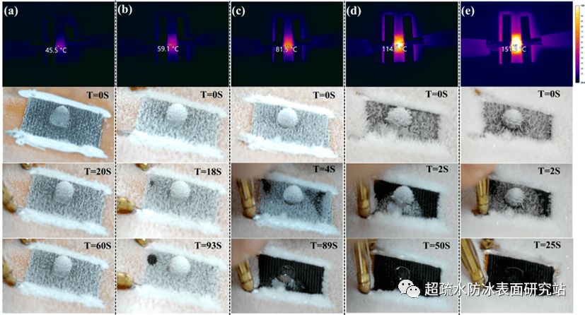 圖7 (a - e) 3-7v直流電壓供電下的表麵常溫穩態溫度和-23℃環境下的除霜除冰效果。