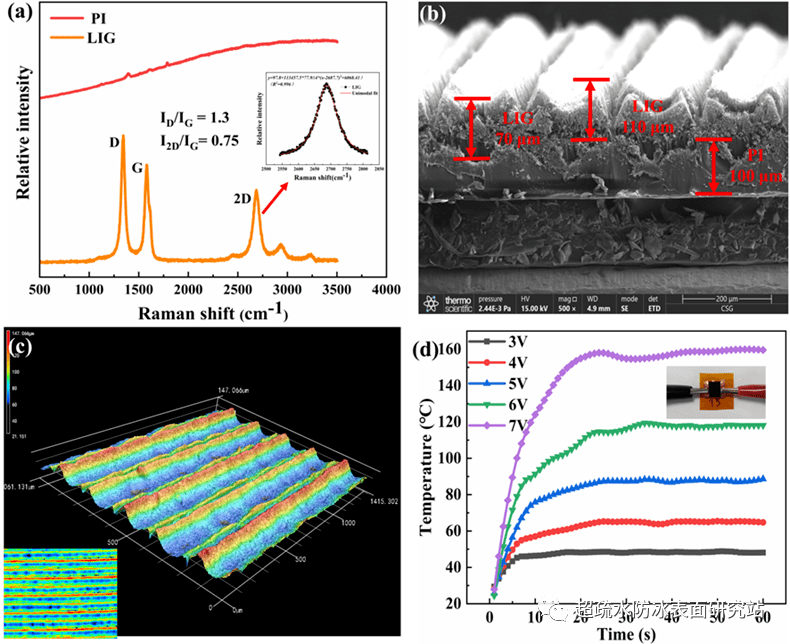 圖6 75 mm/s激光掃描參數下製備的表麵:(a) PI薄膜和石墨烯的拉曼光譜測試圖; (b) 微米結構石墨烯橫截麵形貌; (c)微米級結構石墨烯表麵的三維圖像; (d) 3-7 V(間隔為(wei) 1 V)直流電壓供電下微米結構石墨烯表麵的電熱連接方式和表麵溫度-時間變化曲線。