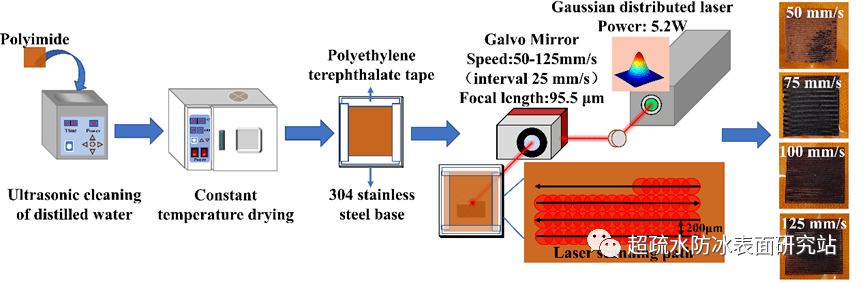 本文麵向當前電熱式主動除防冰高耗能的發展瓶頸,結合當前行業(ye) 內(nei) 疏水材料防冰技術的前沿,借助可同時實現石墨烯生成和精密圖案化設計的激光誘導石墨烯技術(Laser-Induced Graphene, LIG),使用常見的10.6 μm CO2激光直接輻照於(yu) 聚酰亞(ya) 胺薄膜(PI),通過對激光的掃描速度進行調節(50-125 mm/s),在常壓條件下成功地一步製備了同時具有疏水/超疏水性和電熱功能的微米級溝壑狀石墨烯表麵,拓寬了新型除防冰器件的製備方法。