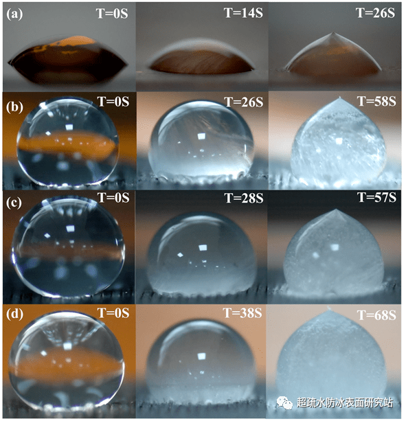 圖3 表麵的延遲結冰效果測試:(a) PI薄膜; (b) 75 mm/s; (c) 100 mm/s; (d) 125 mm/s。