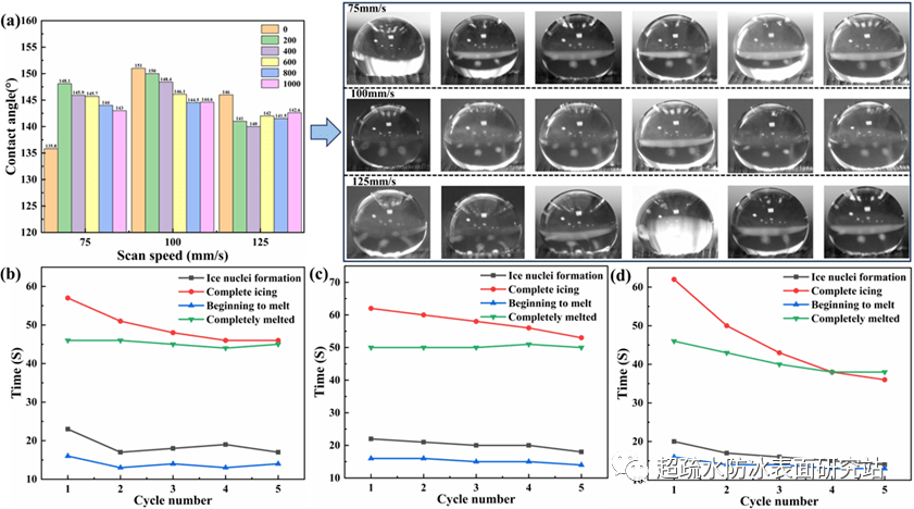 圖4 (a)1000次循環彎曲後表麵接觸角的變化; (b-d) 在循環結冰和融化過程中75 mm/s、100 mm/s和125 mm/s掃描速度下表麵開始凍結、完全凍結、開始融化和完全融化的時間。