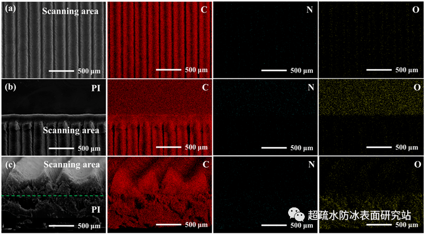 圖5 (a-c)75 mm/s掃描速度下樣品表麵、邊緣和截麵的C、N、O元素能譜圖。