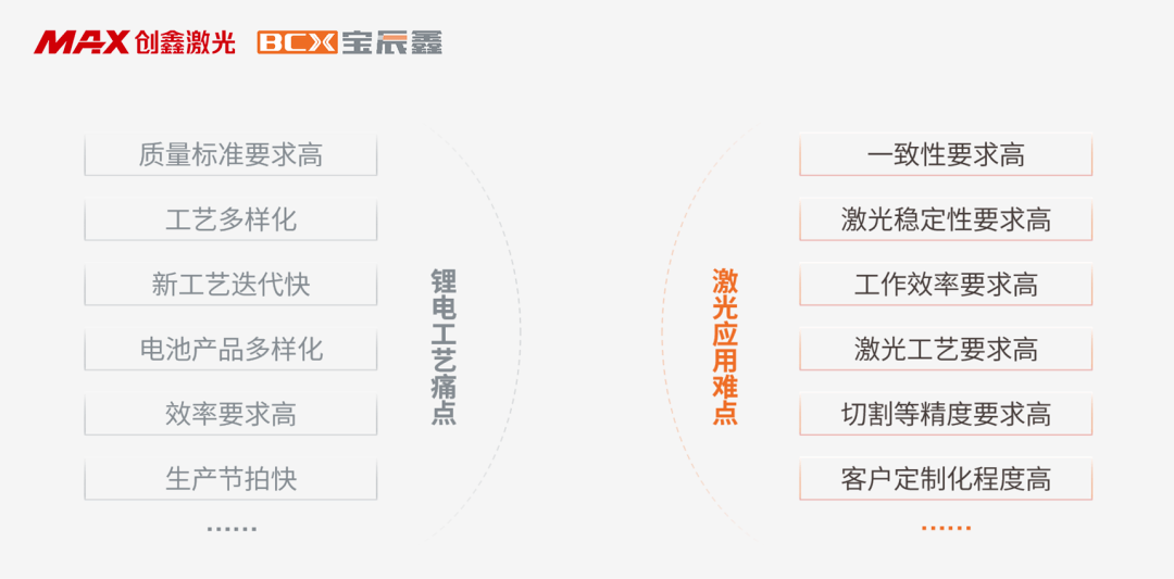 要在動力電池的生產(chan) 製造中實現高標準製造,無論是鋰電工藝本身還是激光應用落地都存在著許多亟需解決(jue) 的問題:動力電池的質量標準要求高,工藝多樣化,新工藝迭代快,電池產(chan) 品多樣化等,都給電池生產(chan) 帶來了諸多挑戰。在激光應用落地過程中,一致性、穩定性、效率、精度等要求高也是工藝難點。