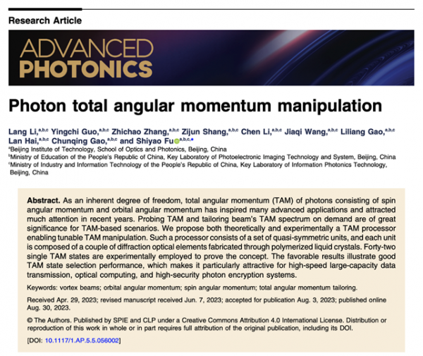 近日,北京理工大學光電學院高春清、付時堯團隊將光學空間坐標變換與(yu) 光子自旋霍爾效應相結合,在國際上首次構建了光子角動量濾波器,實現了光子自旋角動量與(yu) 軌道角動量的按需調控。相關(guan) 成果以 “Photon total angular momentum manipulation” 為(wei) 題發表在在光學頂級期刊Advanced Photonics (SCI一區,IF: 17.3)上。該工作得到了國家重點研發計劃、國家自然科學基金、北京市自然科學基金、博士後創新人才支持計劃等的資助。北京理工大學光電學院2022級博士研究生李浪為(wei) 該論文的第一作者,付時堯特別研究員為(wei) 該論文的通訊作者。