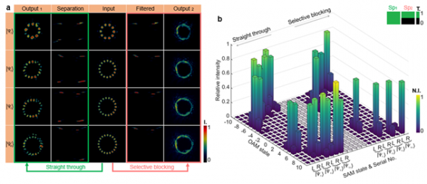 研究團隊針對該係統開展了大量實驗驗證工作,以四TAM疊加態光場入射為(wei) 例,如圖3(a)所示,當分離平麵不做空間濾波時,輸出光場與(yu) 輸入光場保持一致,為(wei) 花瓣狀標量渦旋光場;而空間濾波後的輸出光場由於(yu) 兩(liang) 個(ge) 單TAM模式被濾除,轉換為(wei) 經典不可分類 Bell態 ,表現為(wei) 圓環狀柱矢量光場。輸入與(yu) 輸出係統光束的總角動量譜變化如圖3(b)所示。