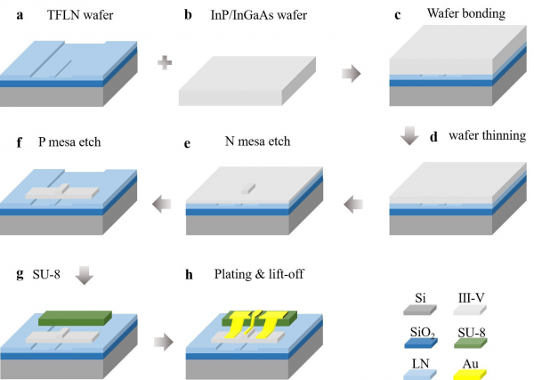 (a) 帶有預定義(yi) 波導和無源元件的TFLN晶圓。(b)裸InP/InGaAs晶圓。(c) InP/InGaAs晶圓和 TFLN 晶圓鍵合。(d) InP/InGaAs晶圓襯底去除。(e) N mesa幹蝕刻。(f) P mesa幹蝕刻。(g) CPW 焊盤的SU-8基底。(h) 金屬電鍍和脫模。