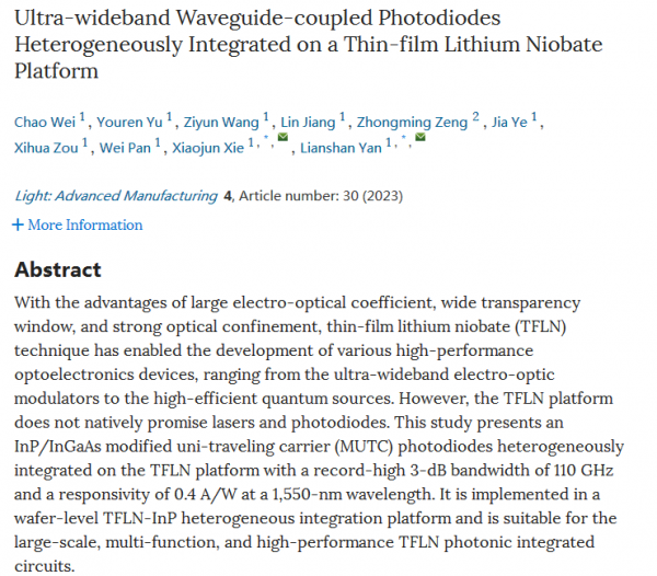 研究人員證明,在TFLN平台上異構集成光電二極管具有應用於(yu) 下一代高速傳(chuan) 輸係統的潛力。