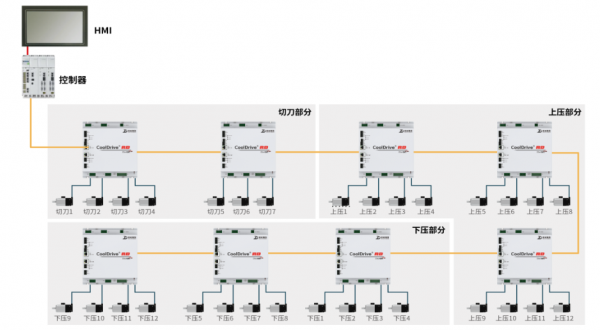 問 題 為(wei) 兼容不同幅寬的裁切壓線需求,縱切壓線機會(hui) 配置盡量多的切刀:如5刀8線需要21台伺服電機,7到12線則需要31台伺服電機… 動輒幾十台的伺服軸,產(chan) 生了以下問題: 1、需要係統具有更高的同步精度和控製精度 2、安裝調試費時費力,降低工作效率 3、電氣櫃空間緊張,影響散熱效果