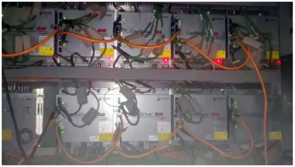 解決(jue) 方案 CoolDrive RD高性價(jia) 比多軸一體(ti) 伺服驅動產(chan) 品係列具備極高的性價(jia) 比和功率密度,產(chan) 品采用EtherCAT通信方式,體(ti) 積小而緊湊,支持多種形式電櫃安裝。220V和380V電源電壓等級,2 - 35A輸出電流範圍及2 ~ 6軸的產(chan) 品多軸行業(ye) 定製。搭配TD係列伺服電機,滿足所有輕載工業(ye) 機器人應用需求,也可用於(yu) 半導體(ti) 設備,包裝設備等多軸智能裝備行業(ye) 。 瓦楞縱切壓線機一般為(wei) 多軸控製,以7刀12線為(wei) 例,需要使用31台伺服電機,如采用傳(chuan) 統的脈衝(chong) 控製,接線複雜、容易出錯,整體(ti) 成本高。 RD支持EhterCAT總線通訊,采用分布式時鍾同步,精確同步(<1μs),傳(chuan) 輸速率可達2×100Mbaud(全雙工模式),實時性高, 接線簡單,維護方便,避免了脈衝(chong) 控製方式時的接線繁瑣,丟(diu) 脈衝(chong) 導致定位精度不準,且使用成本低。基於(yu) 實時以太網總線的同步通訊能力,從(cong) 根本上將設備的實時性和運行效率提升到一個(ge) 新的台階。 現場應用 ▲