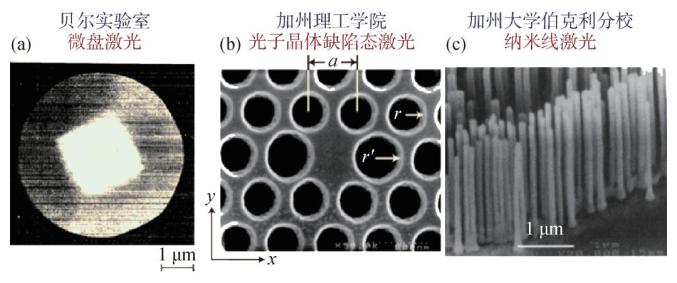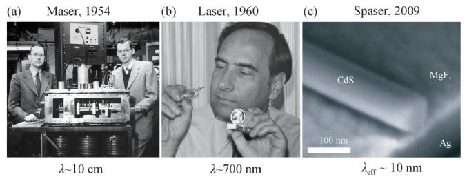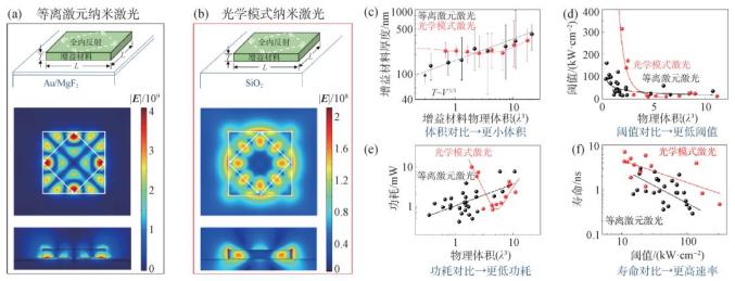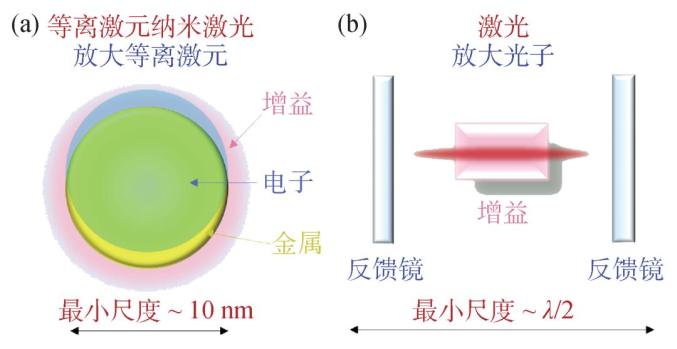 關(guan) 鍵詞 光與(yu) 物質相互作用,真空零點能,珀塞爾效應,激光微型化,微納激光,等離激元納米激光 01 真空光子態在光輻射中的重要作用與(yu) 激光微型化 光輻射是由輻射源和其所處的輻射環境共同決(jue) 定的,對這一光與(yu) 物質相互作用基本觀點的深刻理解推動了現代物理學的發展。從(cong) 黑體(ti) 輻射普朗克定律到費米黃金法則,再到珀塞爾效應與(yu) 腔量子電動力學,真空光子態在其中均扮演了重要角色(圖1)。 圖1 真空光子態在光輻射中具有重要作用。普朗克黑體(ti) 輻射定律中的 是真空光子態密度;費米黃金法則中的ρ(v)為(wei) 光子態密度;光學腔中的光子態密 與(yu) 真空光子態密度 的比值給出了輻射速率增強的珀塞爾因子 1900年普朗克給出了普朗克黑體(ti) 輻射定律: 其中S(ν)是黑體(ti) 單位頻率間隔內(nei) 輻射的能量密度; 是真空光子態密度,可通過計算一個(ge) 邊長遠大於(yu) 自由空間波長的立方體(ti) 腔的態密度來獲得;hv是單個(ge) 光子的能量; 是玻色—愛因斯坦統計給出的在能量hv上占據的光子數。光量子假說是愛因斯坦在1905年提出的,而玻色—愛因斯坦統計是在1924年提出的,盡管這些概念在1900年還不存在,但普朗克定律本身表明真空光子態在光輻射中扮演著重要角色。 1916年,愛因斯坦通過研究熱平衡下輻射體(ti) 吸收與(yu) 輻射之間的關(guan) 係,簡潔明確地推導出了普朗克黑體(ti) 輻射定律,並揭示出了一種新的輻射機製——受激輻射,同時他給出了受激輻射係數與(yu) 自發輻射係數之間的關(guan) 係[1]。受激輻射為(wei) 激光的發明奠定了基礎。對自發輻射的深入理解在量子力學和量子電動力學的建立和發展過程中起到了關(guan) 鍵作用。在激光發明之後,對自發輻射的深入理解也揭示了激光微型化的重要意義(yi) ,持續推動了微納激光的發展。 1946年,珀塞爾(E. M. Purcell)指出通過將原子與(yu) 腔耦合可以改變其自發輻射的速率[2]。珀塞爾當時在研究核磁共振現象,他預測在諧振結構(例如諧振電路)中,原子的自發輻射速率可以被顯著地加快。珀塞爾利用費米黃金法則計算了自發輻射速率並解釋了增強效應。一個(ge) 輻射源從(cong) 初始態 到最終態 的自發輻射速率γ可由費米黃金法則計算得到: 其中τsp是輻射源的自發輻射壽命,H是輻射源—光子態相互作用哈密頓量,ρ(v)是光子態密度,這裏H的矩陣元是體(ti) 積歸一化的。在真空中,ρ(v)是 。在有限大小的腔體(ti) 中,光子態密度從(cong) 連續變為(wei) 離散,對於(yu) 某個(ge) 光子態(腔模),光子態密度為(wei) ,其中∆v=v/Q,Q和Vm是該光子態的品質因子和模式體(ti) 積。在弱耦合情況下, 與(yu) 的比值給出了自發輻射速率的珀塞爾增強因子。 1947年,蘭(lan) 姆(W. E. Lamb Jr.)實驗上發現了氫原子2S1/2和2P1/2能級之間由於(yu) 真空光子態的零點能所引起的劈裂(蘭(lan) 姆位移)[3]。蘭(lan) 姆位移的發現揭示了真空零點能對光與(yu) 物質相互作用的重要影響,推動了量子電動力學的發展。 對真空光子態在光輻射中的作用的進一步深刻理解開啟了腔量子電動力學領域。早期的工作包括H. B. G. Casimir和D. Polder在1948年對原子和腔相互作用能的研究[4],以及E. T. Jaynes和F. W. Cummings在1963年對輻射源和高品質因子光腔之間強耦合現象的研究[5]。K. H. Drexhage等人在1966年進行了開創性的實驗工作,觀察到稀土離子熒光壽命可被金屬薄膜調製的現象[6]。1981年,D. Kleppner指出光子態密度的改變不僅(jin) 可以增強自發輻射還可以抑製自發輻射[7]。為(wei) 了實現抑製效應,他提出了將輻射源與(yu) 低於(yu) 截止頻率的波導耦合的方案。低於(yu) 截止頻率時,波導的態密度遠小於(yu) 自由空間的光子態密度,因此可以大幅度地抑製自發輻射。 1983年,P. Goy等在裏德伯原子與(yu) 毫米波光腔耦合係統中觀察到了腔增強的單原子自發輻射[8]。1985年,G. Gabrielse和H. Dehmelt在裏德伯原子與(yu) 微波腔的耦合係統中觀察到了自發輻射被抑製的現象[9]。不久之後,光波段下的自發輻射調製在原子—光學腔耦合係統中被成功實現[10,11]。輻射源—光腔耦合腔量子電動力學係統的發展使得測量和操控單個(ge) 光子的量子特性成為(wei) 可能,相關(guan) 研究獲得了2012年諾貝爾物理學獎。 由於(yu) 自發輻射在發光二極管、激光、光電探測器和太陽能電池等半導體(ti) 光電器件中起著關(guan) 鍵作用,固態係統中自發輻射的調控也引起了學界的極大關(guan) 注[12—15]。 在1990年前後,人們(men) 發現激光的閾值和調製速率會(hui) 受到激光尺寸的影響[16—19]。首先,微型化激光具有更小的增益材料體(ti) 積和更大的自發輻射耦合因子,因此其閾值可以更低。同時,微型化激光具有更快的自發輻射以及受激輻射速率,因此其調製速率更快。自那時起,實現體(ti) 積更小、閾值功耗更低、調製速率更快的微型化激光一直是相關(guan) 領域研究的焦點。 02 激光微型化:從(cong) 微波激射器、激光到表麵等離激元納米激光 2.1 微波激射器 1954年,J. P. Gordon,H. J. Zeiger和C. H. Townes實現了微波激射器(microwave amplification by stimulated emission of radiation,Maser)[20]。他們(men) 利用處於(yu) 激發態的氨分子作為(wei) 增益介質,並使用約12 cm長的微波腔提供反饋,實現了波長約為(wei) 12.56 cm的微波激射(圖2(a))。1958年,A. L. Schawlow和C. H. Townes提出了以鉀蒸汽作為(wei) 增益介質實現紅外和可見光波段微波