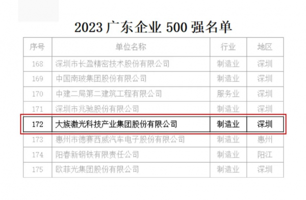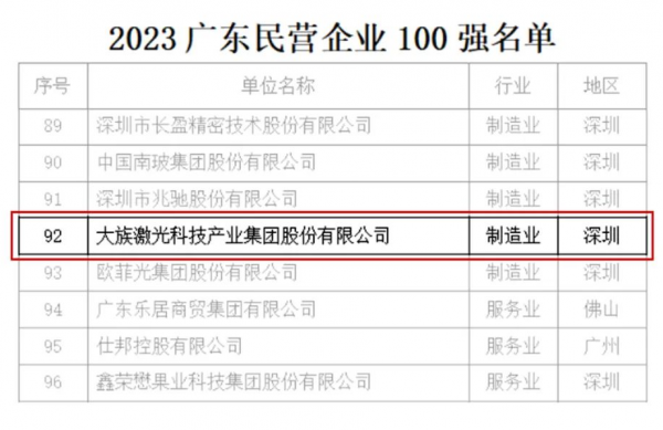 近日,廣東(dong) 省企業(ye) 聯合會(hui) 、廣東(dong) 省企業(ye) 家協會(hui) 在廣州舉(ju) 辦2023廣東(dong) 500強企業(ye) 發展大會(hui) ,此次大會(hui) 以“強化龍頭引領,推動產(chan) 業(ye) 升級”為(wei) 主題,正式發布2023廣東(dong) 企業(ye) 500強榜單。大族激光憑借雄厚的綜合實力和穩健表現,入圍廣東(dong) 企業(ye) 500強,同時上榜2023廣東(dong) 省民營企業(ye) 100強和2023廣東(dong) 省製造業(ye) 民營企業(ye) 100強,分別位列92名、74名。