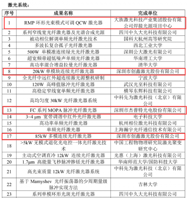 可喜的是,深圳市激光智能製造行業(ye) 協會(hui) 5家會(hui) 員單位在列,其中,副會(hui) 長單位大族激光的“RMP環形光束模式可調QCW激光器”、副會(hui) 長單位傑普特的“FC係列MOPA脈衝(chong) 光纖激光器”、以及會(hui) 員單位創鑫激光的“20kW單模塊連續光纖激光器”、“85kW多模連續光纖激光器”入選激光係統提名名單,另外,副會(hui) 長單位水滴激光的“飛機蒙皮複合高功率激光清洗係統”、“高鐵齒輪變速箱7000W複合激光清洗係統”與(yu) 會(hui) 員單位星漢激光的“高功率半導體(ti) 激光器”則入選應用裝備提名名單。