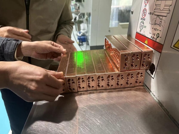 走進熱刺激光的機加工車間,眼前幾十台加工設備正閃著綠燈快速運轉,一條條紫銅原料通過自動化設備一路完成開粗、打孔、精加工等環節,成為(wei) 形似插線板的泵浦源外殼。