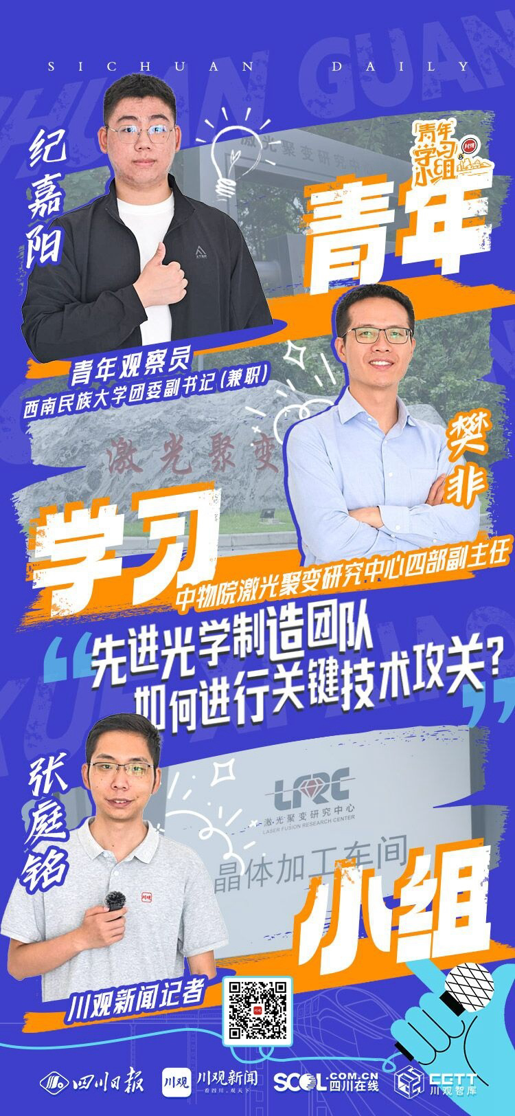 本期川觀青年學習(xi) 小組,我們(men) 和青年觀察員西南民族大學團委副書(shu) 記(兼職)紀嘉陽同學一起,走進中物院激光聚變研究中心先進光學製造團隊(以下簡稱“先進光學製造團隊”),去看看這個(ge) 獲得了“四川青年五四獎章集體(ti) ”的青年團隊在關(guan) 鍵技術攻關(guan) 中做了哪些努力?