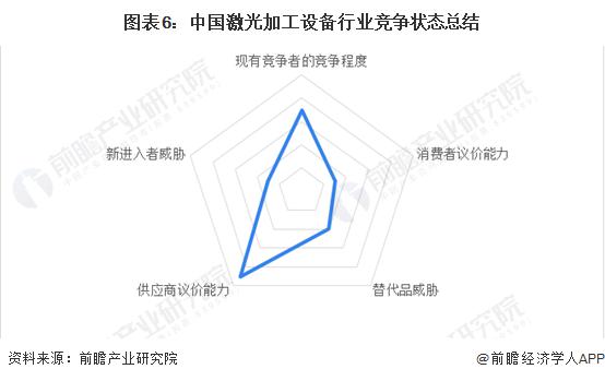 從(cong) 五力競爭(zheng) 模型角度分析,激光加工設備上遊供應商為(wei) 原材料和核心係統供應商等企業(ye) ,核心零部件廠商議價(jia) 能力較強。下遊市場主要是汽車、航空航天、電子製造等領域,議價(jia) 能力較弱。激光加工設備對於(yu) 新型工業(ye) 領域的發展非常重要,其替代品威脅較小。在高端產(chan) 品領域,目前競爭(zheng) 者數量有限,中低端產(chan) 品領域市場競爭(zheng) 者較多,現有企業(ye) 競爭(zheng) 激烈。 激光加工設備屬於(yu) 技術密集型企業(ye) ,技術壁壘打破難度大,綜合而言潛在進入者威脅較小。