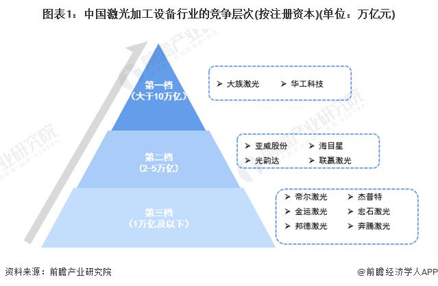 激光加工設備行業(ye) 按照企業(ye) 的注冊(ce) 資本劃分可分為(wei) 三個(ge) 競爭(zheng) 梯隊。注冊(ce) 資本在 10 萬(wan) 億(yi) 以上的有大族激光和華工科技。注冊(ce) 資本在 2 至 5 萬(wan) 億(yi) 元左右的有亞(ya) 威股份和光韻達等。注冊(ce) 資本在 1 萬(wan) 億(yi) 及以下的帝爾激光、金運激光等。