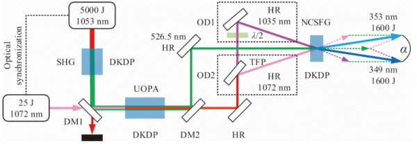 之前的CPL方案是將不同頻率的子光束分別進行參量放大和三倍頻轉換,最後通過合束來產(chan) 生單一的多色光,這導致了係統的冗雜和轉換效率低下。據此我們(men) 提出了產(chan) 生頻率差為(wei) 1%的新型NCPL方案,使得晶體(ti) 數量得到了有效控製,具體(ti) 如圖2所示。該方案主要涉及的非線性光學過程有非飽和參量放大和非共線和頻(NCSFG),兩(liang) 束不同頻率的子光束最終通過二倍頻泵浦光與(yu) 1035 nm和1072 nm基頻光的NCSFG過程在同一塊DKDP晶體(ti) 中產(chan) 生。與(yu) 傳(chuan) 統的驅動器方案相比,隻有三倍頻過程被NCSFG代替,因此兩(liang) 者的轉換效率是相當的。