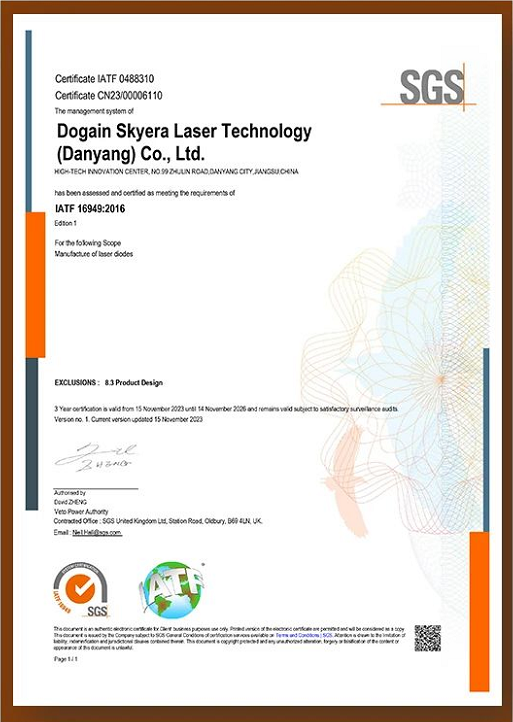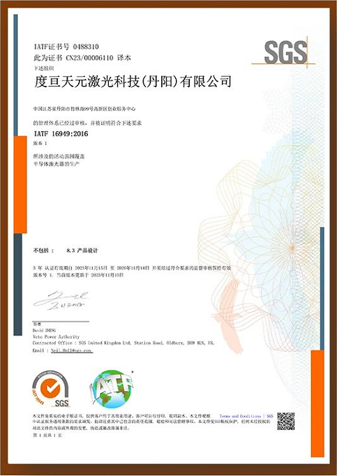 度亙(gen) 天元激光激光器專(zhuan) 業(ye) 從(cong) 事半導體(ti) 激光器產(chan) 品設計開發、生產(chan) 及銷售。公司成立以來堅持以質量為(wei) 核心,不斷提升產(chan) 品質量和服務水平,為(wei) 客戶提供高品質、可靠的半導體(ti) 激光器產(chan) 品。經過專(zhuan) 業(ye) 機構嚴(yan) 格審查,度亙(gen) 天元激光與(yu) 2023年11月順利通過IATF16949:2016質量體(ti) 係認證,該體(ti) 係的引入及認證標誌著度亙(gen) 天元激光具備了汽車行業(ye) 的車載激光雷達應用領域的產(chan) 品供應能力與(yu) 資質,為(wei) 拓展本公司在車載激光雷達應用市場奠定了基礎。