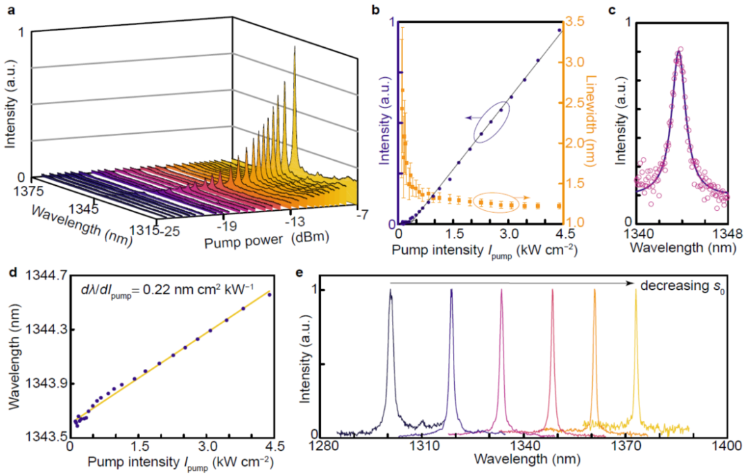 圖2:狄拉克渦旋拓撲激光器的實驗表征。a,狄拉克渦旋激光器的微區熒光光譜隨泵浦功率的變化。b,微區熒光光譜強度(紫色點)和線寬(橙色方塊)隨泵浦強度的變化。c,當泵浦強度為(wei) 0.395 kW cm−2時測得的微區熒光光譜。d,激光波長(紫色點)隨泵浦強度的變化。e,不同狄拉克渦旋激光器的激光光譜,表明可以實現1300–1370 nm波長範圍內(nei) 的精確調控。
