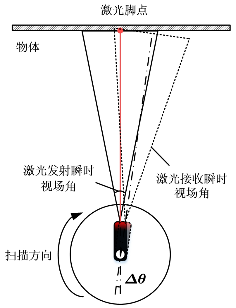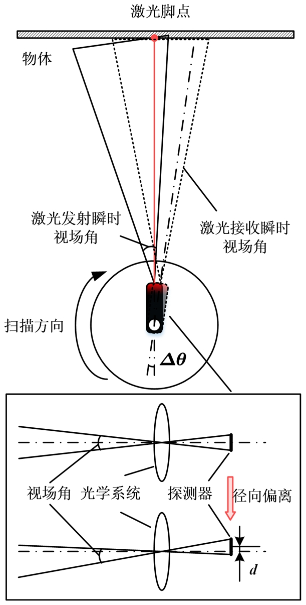 在常用的旋轉反射鏡、多麵鏡等掃描方式中,由於(yu) 激光發射到回波接收存在時間差,在這個(ge) 時間差內(nei) ,掃描機構已旋轉了一定角度,導致目標回波被激光雷達接收時,激光腳點與(yu) 瞬時視場角中心產(chan) 生偏移,也即回波經接收光學係統聚焦位置與(yu) 探測器靶麵中心產(chan) 生了偏移。