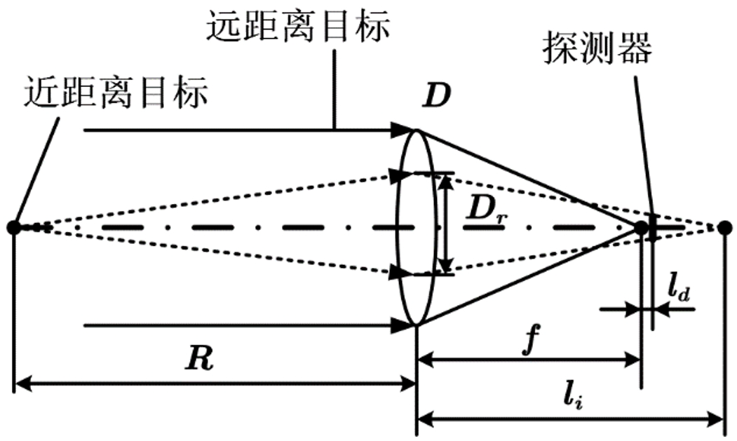 對於(yu) 不同距離的回波而言,遠距離回波可近似為(wei) 平行光,光斑聚焦在光學係統焦點;近距離回波聚焦在焦點之後的位置。當離焦光斑尺寸大於(yu) 探測器靶麵尺寸時,僅(jin) 有探測器靶麵內(nei) 的回波能量被接收,等效於(yu) 視場光闌限製了收光孔徑。因此,在合理軸向偏離量的情況下,能夠實現遠距離目標的微弱回波能量被全部接收,近距離目標的強回波能量被衰減,進而提高激光雷達係統的測距動態範圍。