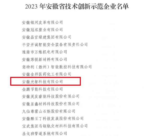 11月29日,安徽省經信廳發布了《安徽省經濟和信息化廳關(guan) 於(yu) 公布2023年安徽省技術創新示範企業(ye) 名單的通知》。經各市經信部門推薦、專(zhuan) 家評審、社會(hui) 公示等環節,安徽光智脫穎而出,成功獲評2023年安徽省技術創新示範企業(ye) !