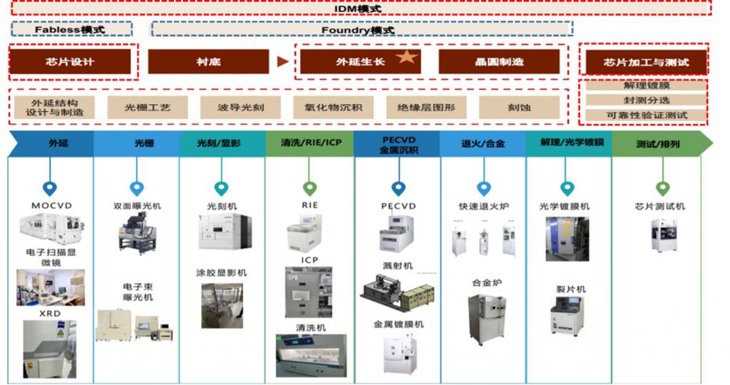 華辰芯光擁有一個(ge) 研製激光芯片全流程成建製海外歸國專(zhuan) 家創業(ye) 團隊。公司采用 IDM 模式生產(chan) 芯片 ,自建了芯片設計平台、材料生長平台、器件前端工藝平台、器件後端工藝平台、可效性與(yu) 機理分析平台、封裝測試平台等激光芯片全流程研發和製造功能模塊,並且每個(ge) 功能模塊華辰芯光都掌握有大量的 know-how 核心技術。