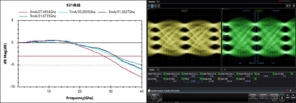 華辰芯光單波 100G PAM4 VCSEL 光芯片產(chan) 品帶寬特性及模塊眼圖特性