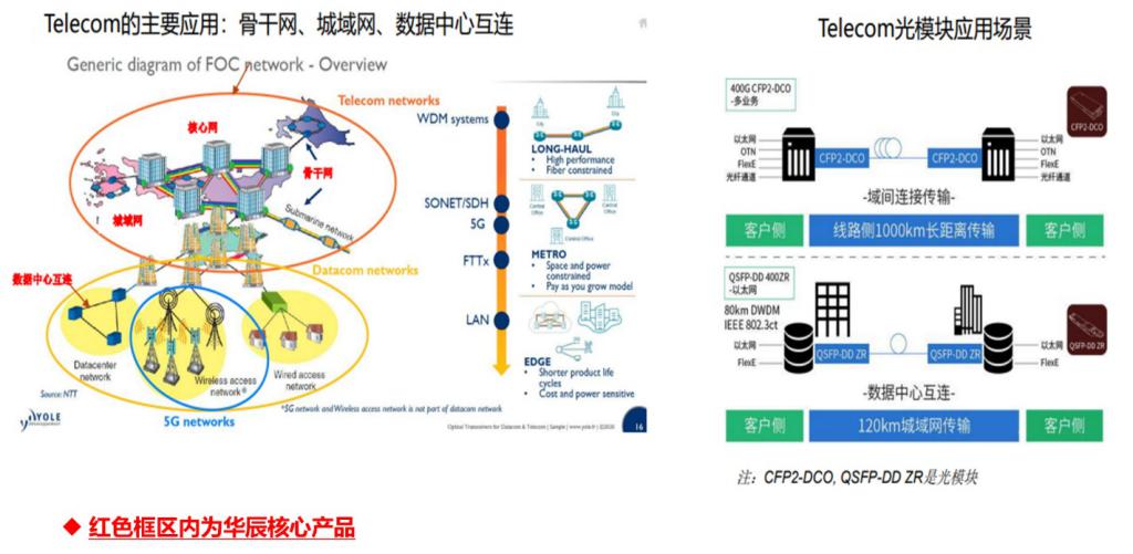 華辰芯光的光通信芯片可以應用於(yu) 核心網、骨幹網、城域網、數據中心互聯等領域。