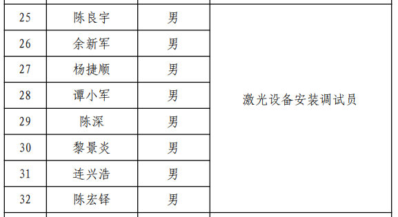 根據12月5日深圳市人力資源和社會(hui) 保障局公布的“2023年深圳技能大賽獲獎名單”,該局對優(you) 勝選手及在參賽辦賽中作出突出貢獻的單位名單予以公布。在本次大賽認定的244名“深圳市技術能手”中,被認定為(wei) “深圳市技術能手”的激光設備安裝調試員共有8人,名單如下: