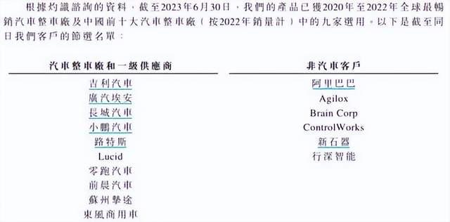 這一先發優(you) 勢也延續至今,招股書(shu) 顯示,截至 2023 年 3 月 31 日:速騰聚創已成功取得 21 家汽車整車廠及一級供應商的 52 款車型的前裝量產(chan) 定點預期訂單,位居全球第一。根據灼識谘詢的資料,截至同日,速騰聚創的激光雷達產(chan) 品已被全球最暢銷汽車整車廠(按 2020 年至 2022 年銷量計)及按中國前十大汽車整車廠(按 2022 年銷量計)中的九家選用,包括中國最大的汽車整車廠及全球最大的新能源汽車整車廠。其中,主要客戶包括吉利汽車、廣汽埃安、長城汽車、小鵬汽車、路特斯、Lucid、零跑汽車等。
