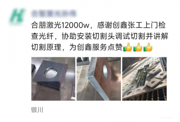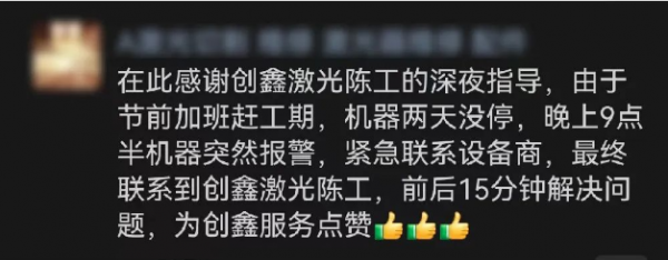 眾(zhong) 所周知,對於(yu) 工業(ye) 設備用戶來說,時間就是效益(金錢)。設備一旦出現故障,如果售後服務不及時就會(hui) 要停工,甚至造成訂單無法按時交付。所以終端用戶不僅(jin) 需要品質性能穩定的產(chan) 品,更需要高效周到的售後服務隨時為(wei) 他們(men) 排憂解難。創鑫激光始終把用戶服務放在首位,為(wei) 此組建了一支專(zhuan) 業(ye) 技術過硬、具有豐(feng) 富經驗的“金保姆”服務團隊,為(wei) 客戶和用戶提供完善的售前、售後和在線服務。