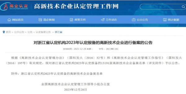 2023年12月28日,高新技術企業(ye) 認定管理工作網發布了《對浙江省認定機構2023年認定報備的高新技術企業(ye) 進行備案的公告》,浙江天弘激光科技有限公司通過2023年度“高新技術企業(ye) ”認證。這是浙江天弘激光2020年成立後首次通過國家級高新技術企業(ye) 認定,也是繼天弘激光蘇州總部複審通過2023年高新技術企業(ye) 認定後的,又一殊榮。