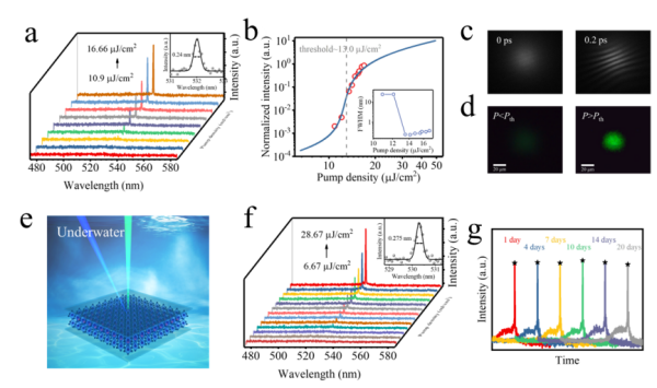 a、亞(ya) 波長垂直腔激光輸出光譜;b、激光輸入輸出圖;c、激光幹涉圖;d、激光輸出光斑圖;e、水下激光示意圖;f、水下激光輸出光譜;g、20天水下激光穩定輸出