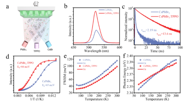 a、三源共蒸示意圖;b、鈣鈦礦熒光光譜;c、熒光壽命;d-f、溫度依賴的熒光光譜的發光強度、半高寬和峰位置圖