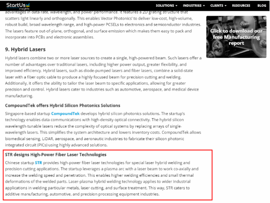 StartUs Insights在出具的行業(ye) 研究報告中指出,“中國企業(ye) 思創激光(STR)為(wei) 特殊激光混合焊接和精密切割應用,提供高功率光纖激光技術。這家公司利用等離子弧與(yu) 激光束同軸工作,提高了焊接速度和穿透力。這使得焊接效率更高,焊接部件的熱變形更小。激光等離子混合焊接技術可廣泛應用於(yu) 特定金屬的焊接、激光切割和表麵處理等工業(ye) 領域。因此,STR可以滿足快速成型製造、汽車和精密加工設備行業(ye) 的需求。”